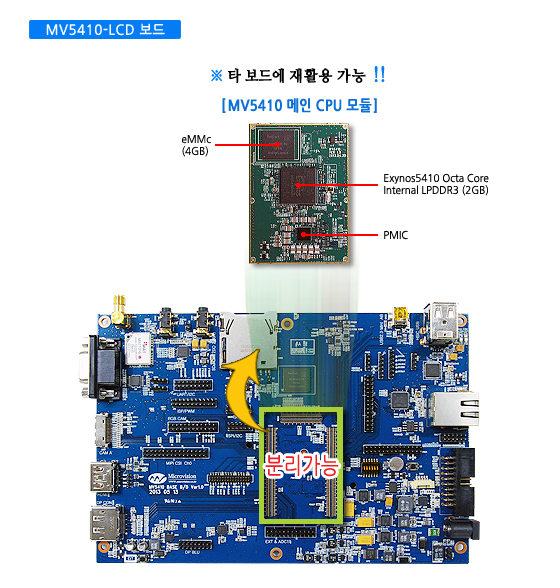 MV5410-LCD는 삼성Exynos5410 Octa Core ( Cortex A15 1.6GHz Quad / A7 1.2GHz Quad ) 기반으로 제작했다. Cortex-A15/A7 Octa Core의 고성능 프로세서인 MV5410 보드는 CPU 내부에 Multi Format Codec 내장되어있어 MPEG2, MPEG4, H.264/H.263, VC1등 다양한 코덱 사용 할 수 있다. 또한 기존에 ARM 프로세서가 갖지 못한 USB 3.0 와 WQXGA 2560 x 1600 기반의 고해상도 디스플레이 인터페이스 지원하므로 차별화된 성능을 볼 수 있다.